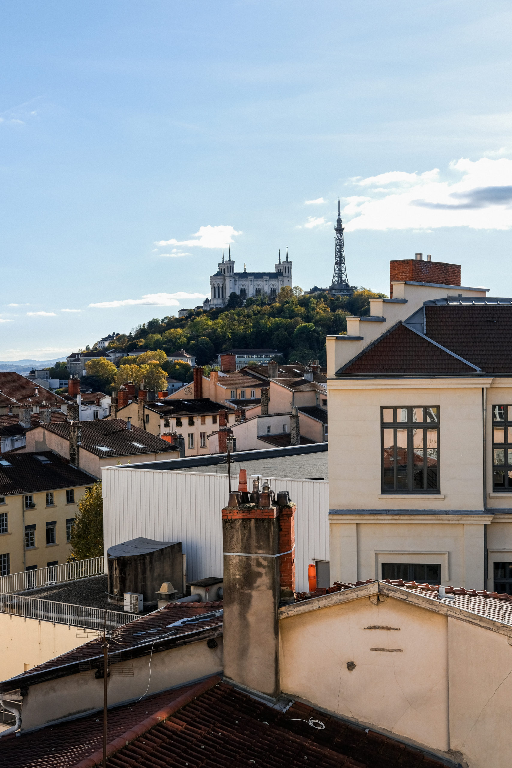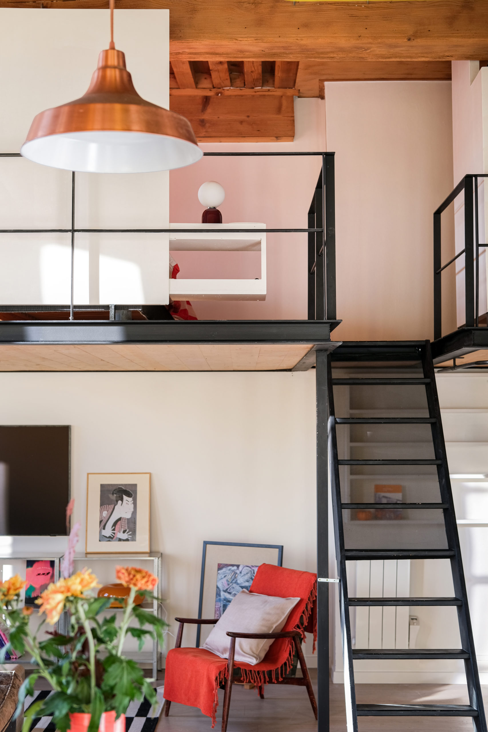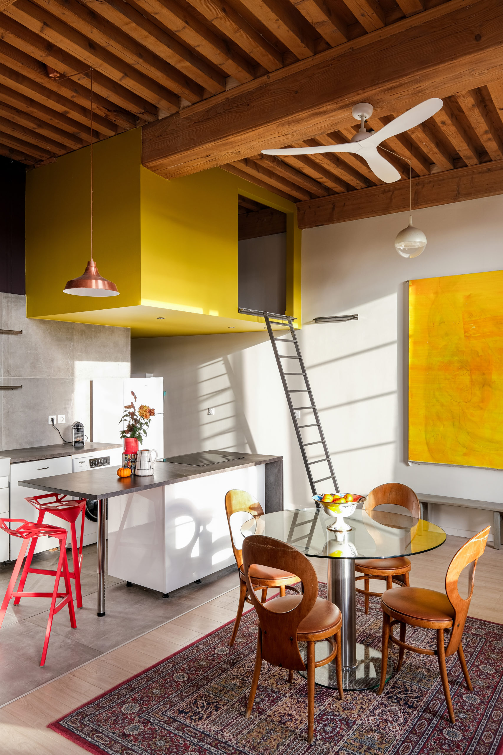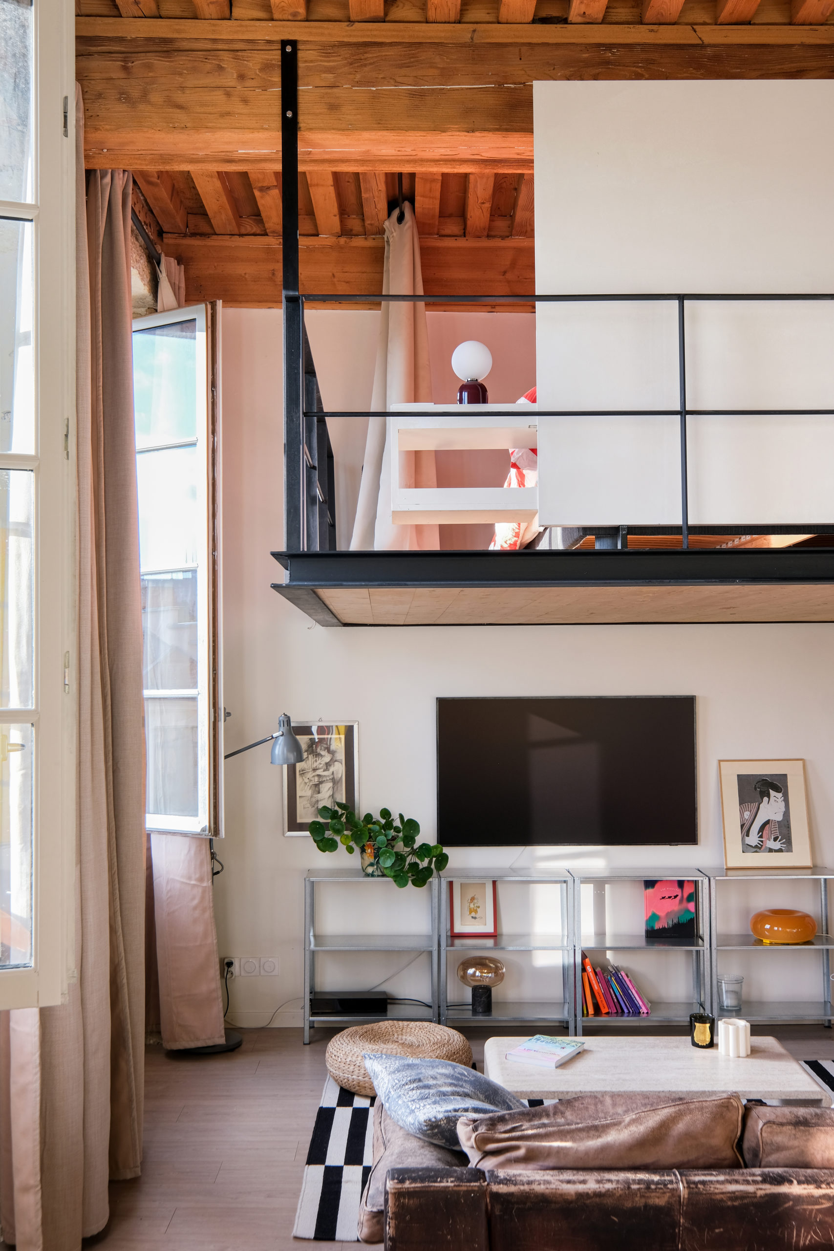 Entre ciel et colline, dans le tissage serré des pentes de la Croix-Rousse, cet appartement canut retrouve souffle et légèreté. Le projet joue avec la verticalité du lieu : deux mezzanines s’élèvent, l’une ouverte comme un belvédère, l’autre refermée en une boîte suspendue, refuge intime au-dessus de l’espace de vie. En contrebas, le séjour s’étire librement, le bureau se glisse dans l’alcôve et la cuisine s’ouvre sur quatre fenêtres baignées de lumière, cadrant la vue sur Fourvière.