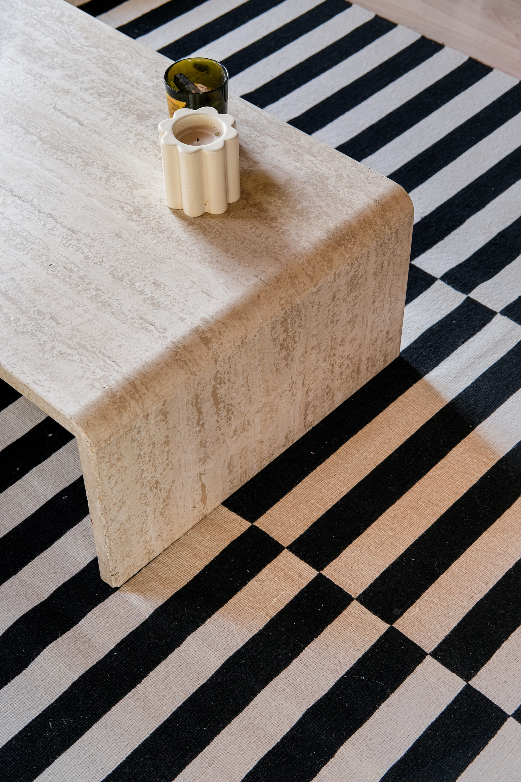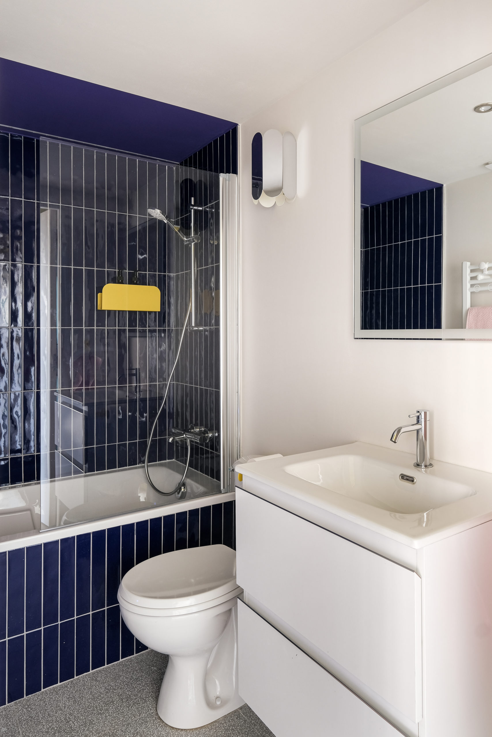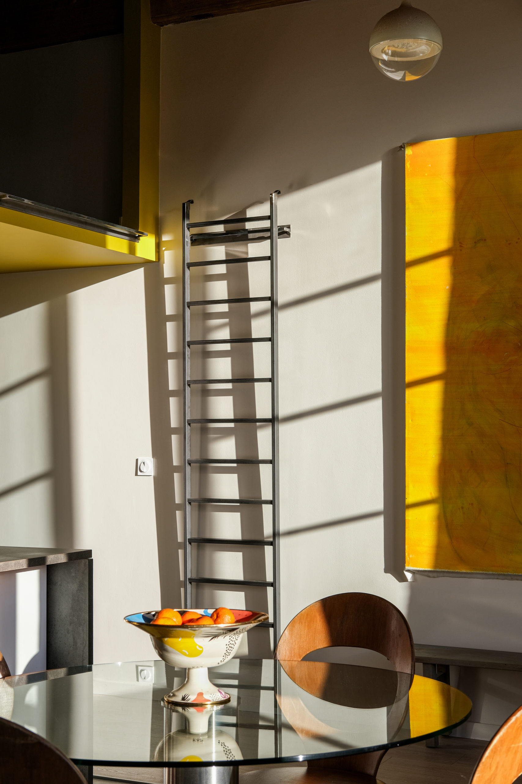 Ici, tout est question d’équilibre et de dialogue : le bois réchauffe le métal, la matière brute rencontre la couleur. Bleu profond, aubergine, jaune, rouge — des touches franches qui ponctuent le blanc et rythment la lumière.